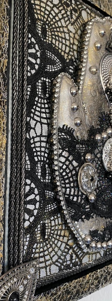 Paint is applied, and then the adornments. After the hand is done, the frame, mat, or plaque is decorated to compliment, and after a lot of detail work, another beautiful hand emerges.