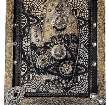 Influenced by her visits to Morocco, artist Valerie Caveglia presents a reinterpretation of a traditional cultural theme, the Hamsa Hand, and blends cultures into an art piece that is both meaningful and beautiful. She has meticulously handcrafted each design, drawing inspiration from her collection of ephemera and artifacts. Her framed Hamsa Hands are perfect for mounting on any wall or over a doorway.